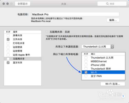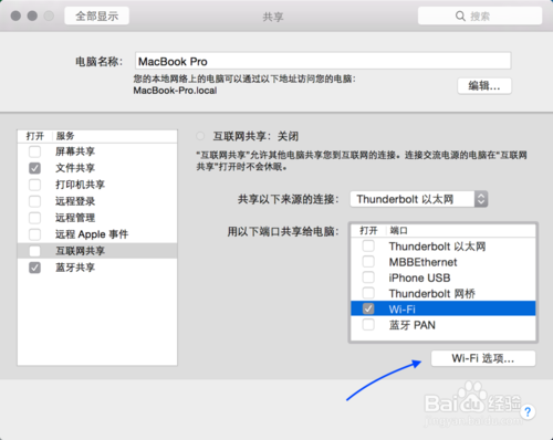 用于共享的网络接口选择好之后,接下来请点击右下方的“wi-fi选项”按钮。