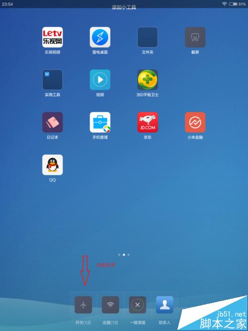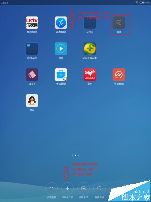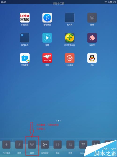2、用手指从最上方向下滑动,出现一个菜单,里面就有截图图标,如果你想在桌面上看到它,还可以按两秒左下角的图标,下方就会出现一个添加小工具的图标,点击它