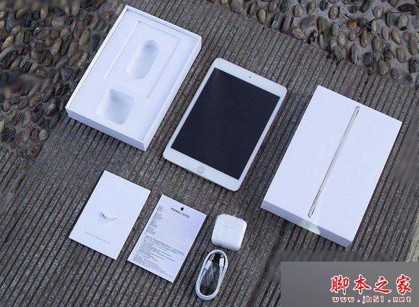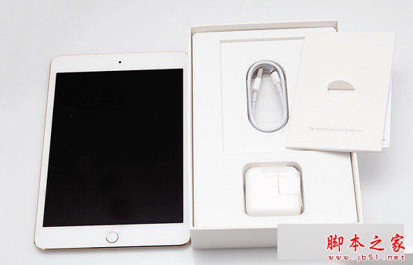 打开简约白色的包装盒,就可以见到ipad mini 4真机与配件了。配件主要包括数据线、充电器、三包凭证等,如下图所示: