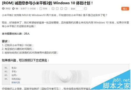 今天,小米在miui官方社区开始招募小米平板2的windows 10系统体验用户,只要购买了小米平板2 16gb版的用户都能申请,但只会招募20人。
