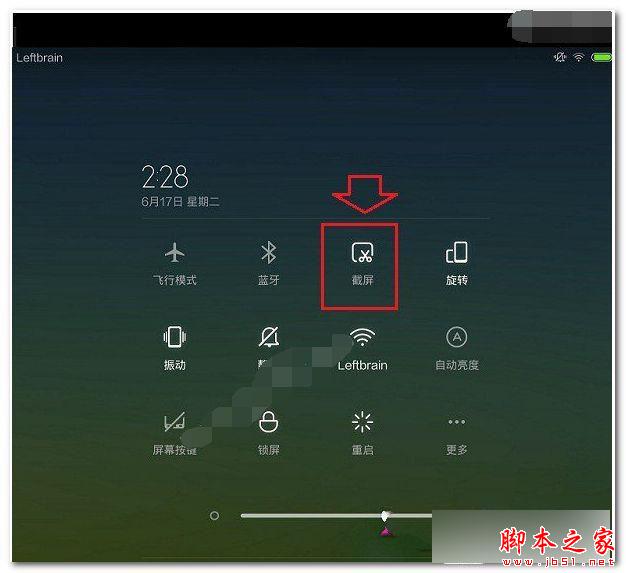 用手指从小米平板2最上面向下划过,打开下拉通知栏菜单后,再从右向左划过,之后会出现截屏图标,如下图所示: