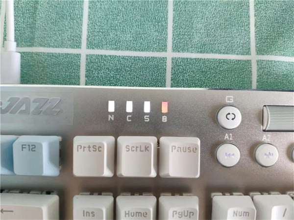 键盘右上角有指示灯和多媒体控制按键,m键切换无线2.4g和蓝牙模式,可显示绿色和蓝色的指示灯,绿色为无线2.4g连接模式,蓝色为蓝牙连接模式,g键可以进行灯效和音量等功能的切换调节,旁边的滚轮可以实现音量大小、灯光亮度调节,a1、a2、a3键以实现音乐播放的上一曲、暂停播放、下一曲功能,也可以通过驱动程序指定不同的功能,让它比普通键盘功能更多。