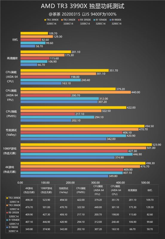 这次的测试对比组是i9-9900k、i9-10940x、r9 3950x、tr3 3960x。对比100%标杆依然是i5-9400f,因为篇幅关系没有放在表格中。