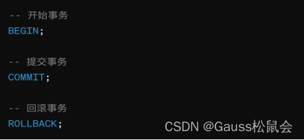 在gaussdb数据库中,使用begin命令开始一个事务,使用commit命令提交事务。如果出现错误或需要回滚事务,可以使用rollback命令。