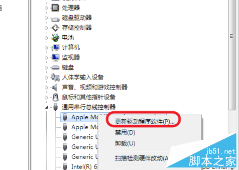 2、没有的话,重新连接ipad,看看是哪个设备,然后右击,选择【更新驱动程序软件】;