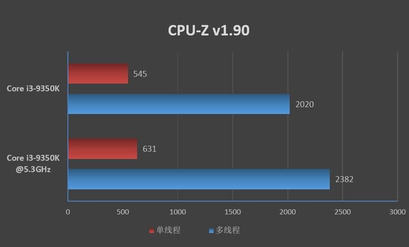 相比默频,超频到5.3ghz的i3-9350k的单线程分数提升了72分,提升幅度15%;