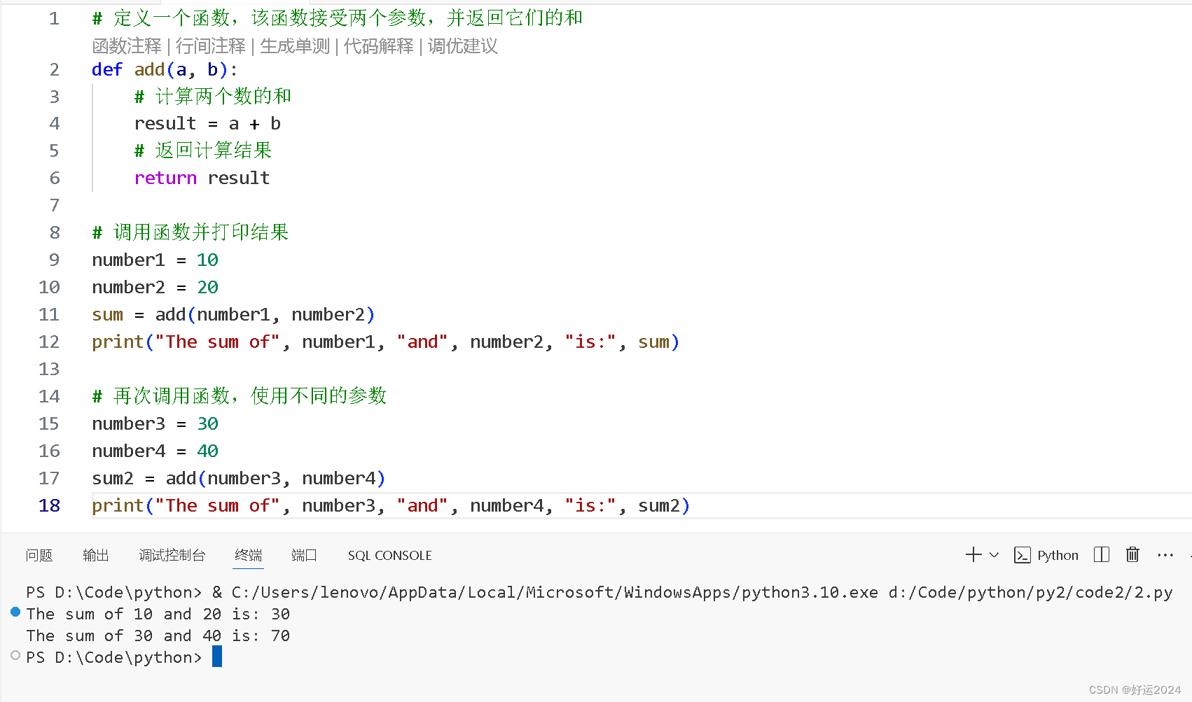 # 定义一个函数,该函数接受两个参数,并返回它们的和