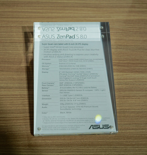 在性能上zenpad s 8.0装备了英特尔64位的atom z3580四核处理器,4gb的内存,powervr g6430 gpu,机身尺寸为203.2×134.5×6.6mm,重量为298g。机身正面配置了500万像素前置摄像头和800万的后置摄像头,16gb的内置存储。