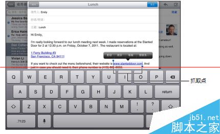 15、编辑文本 如果您需要编辑文本,屏幕放大镜可让您将插入点放置在您所需的位置。您可以选择文本以及剪切、拷贝和粘贴文本。在某些应用程序中,您还可以剪切、拷贝和粘贴照片和视频。 放置插入点: 按住屏幕以调出放大镜,然后拖移以定位插入点。选择文本: 轻按插入点以显示选择按钮。轻按“选择”以选择相邻的单词,或者轻按“全选”以选择所有 文本。 您也可以连按一个单词两次以选择它。拖移抓取点以选择多一些或少一些的文本。在只读文稿(如网页)中,按住屏幕来选择一个单词。