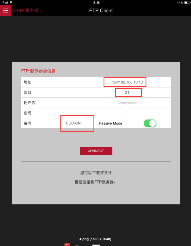 注意是ftp开头的,比如ftp://192.168.10.13编码选择euc_cn,连接,就可以看视频了,2g的mkv都可以流畅播放。