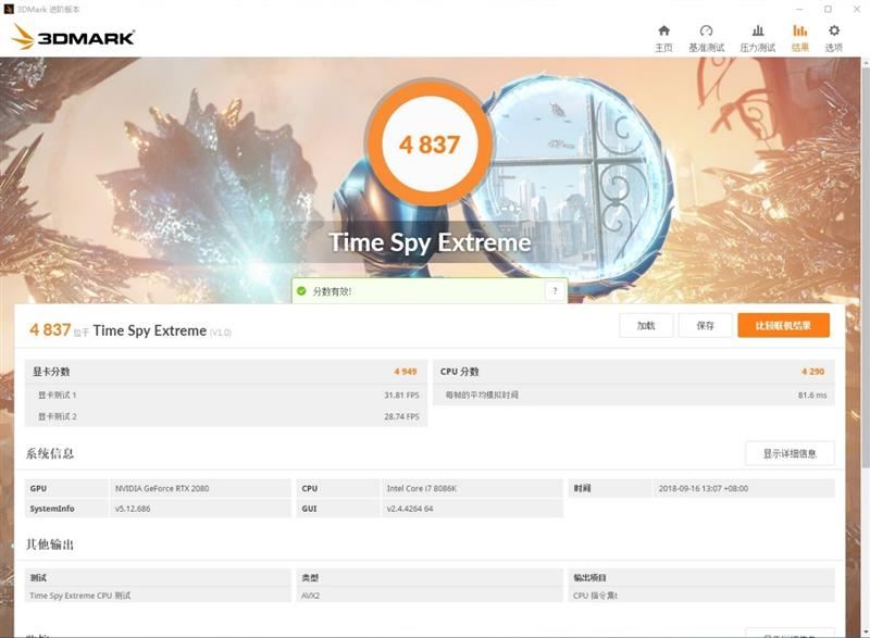 rtx 2080的3dmark time spy extreme跑分,图形分数达到了4949。