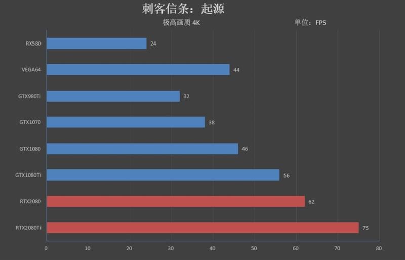 在《刺客信条:起源》测试中,rtx 2080 ti帧率为75fps,领先gtx 1080 ti 帧。