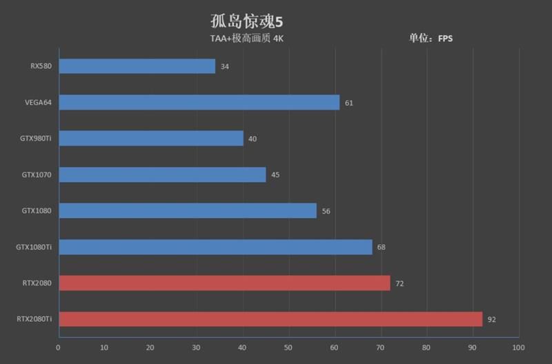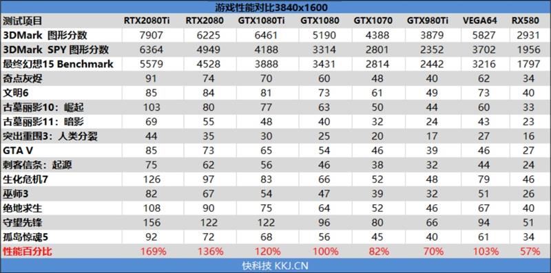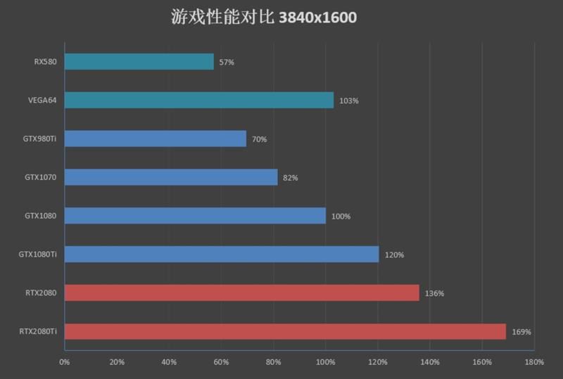 在4k分辨率下,rtx 2080 ti的性能得以释放,相比gtx 1080领先了69%,和gtx 1080 ti相比,有41%的领先幅度。