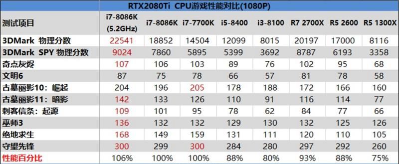 在1080p分辨率下,各种档次的处理器跑出来的游戏帧数差别明显,特别是没有超线程功能里处理器严重限制了rtx 2080 ti的性能。在多款游戏中,r5 1300x与i3-8100与顶级处理器之间都有超过50%的差距。