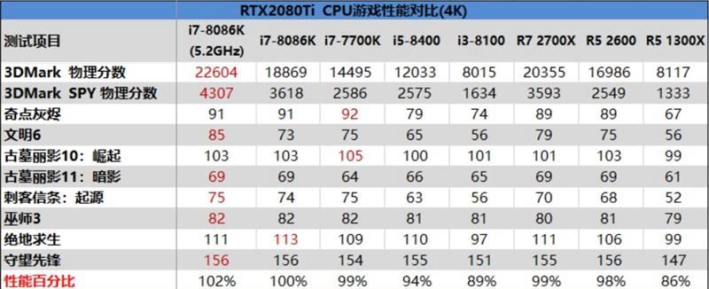 4k分辨率最高特效下,压力都在显卡这一边,除了《奇点灰烬》和《文明6》这2款比较吃cpu的游戏之外,其他游戏游戏的测试中,各款cpu的帧数差距并没有很大。