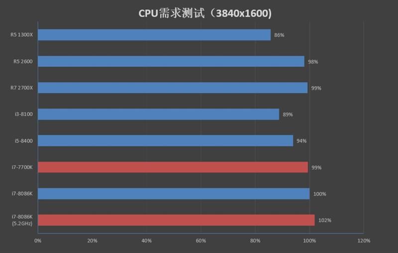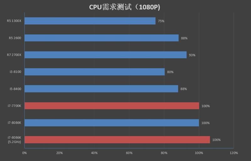 在4k分辨率下,8086k、7700k、2700x、2600在处于同一档次,6核6线程的i5-8400与前面几款产品有6%的差距,r3 1300x和i3-8100这2款处理器落后的幅度没有1080p那么明显,但也有10%以上的差距。