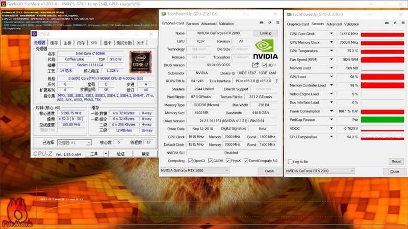 经过5分钟的furmark烤机测试,rtx 2080的温度稳定在75度。