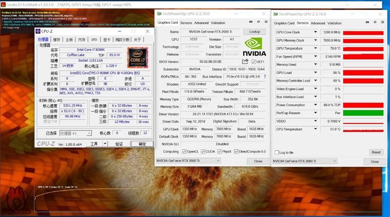 同样是5分钟的furmark烤机测试,rtx 2080 ti的温度则稳定在79度。