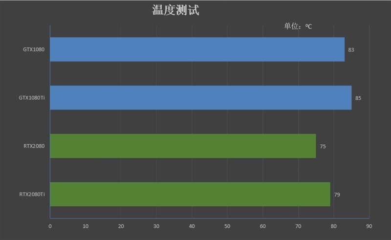 图灵的公版显卡舍弃了原来的涡轮风扇改换成了现在的双风扇散热系统,温度也好看了很多。rtx 2080烤机温度只有75度,比gtx 1080低了8度,rtx 2080 ti机温度为79度,比gtx 1080 ti低了6度。