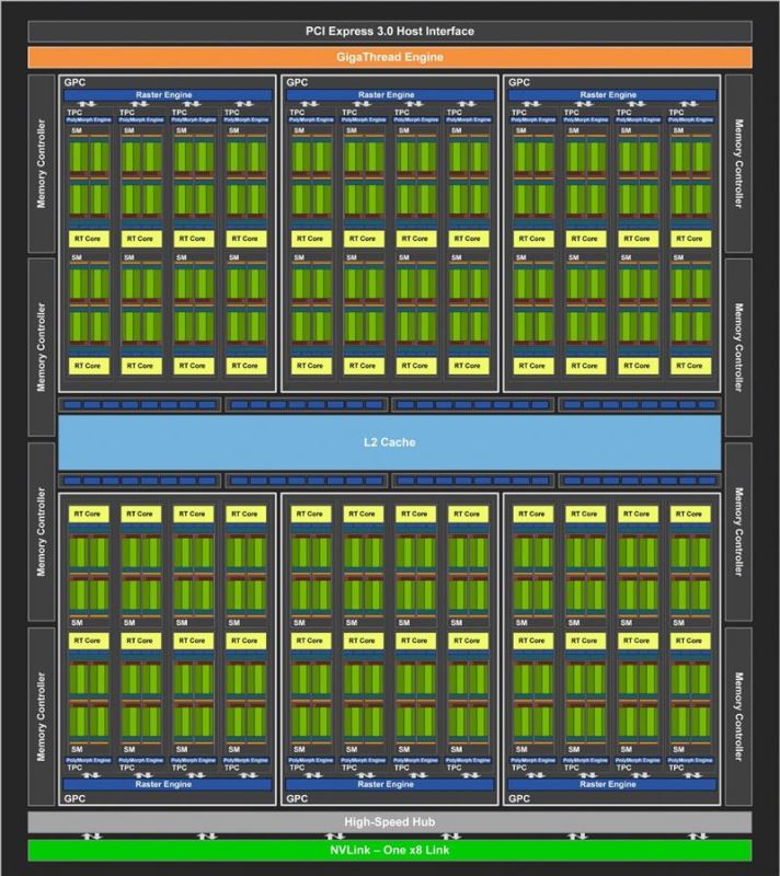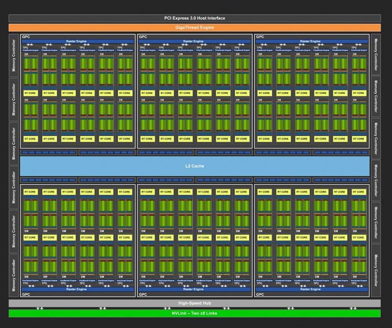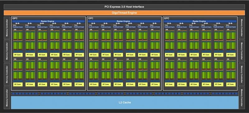 内有4608个cuda核心,分为6组gpc、36组tpc、72组sm阵列(每组sm 64个cuda核心),同时有72个rt核心、576个tensor核心、288个纹理单元、96个rop光栅单元,二级缓存容量6mb,寄存器文件18mb,352-bit位宽。