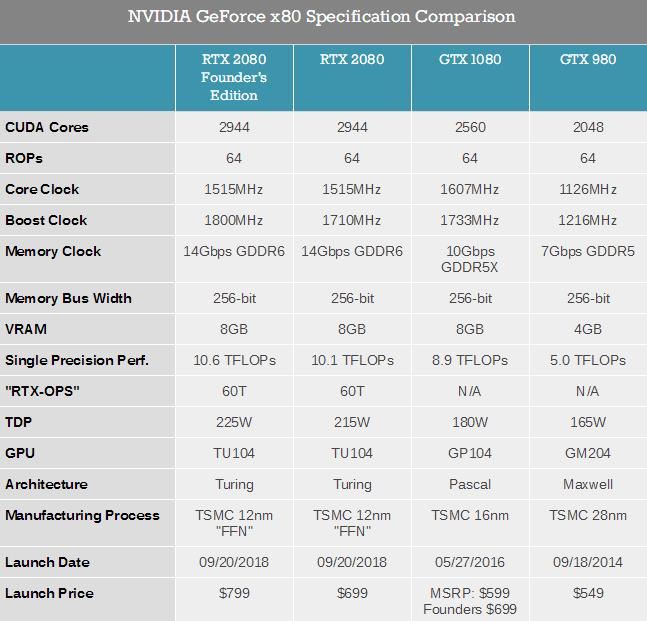 rtx 2080核心基础频率1515mhz,加速频率非公版1710mhz,公版直接定在1800mhz,搭配8gb gddr6显存,等效频率14ghz,带宽448gb/s,功耗225w。