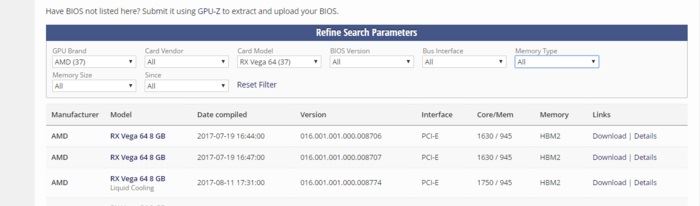 比如,amd rx vega 64系列显卡的bios,找到自己需要的显卡bios。本次测试使用的是蓝宝石rx vega 56超白金限量版显卡,因此我就蓝宝石rx vega 64超白金限量版的bios下载使用。