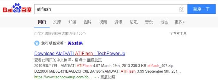 二、然后我们就要准备第二个工具,atiflash。atiflash是ati/amd显卡专用的刷显卡bios工具,我们同样借助度娘,可以很容易在第一行就找到他。需要注意的是,旧版的atiflash对win10系统和最新的amd显卡可能会不兼容,或者提示找不到ati离散视频卡,最好下载最新的版本。