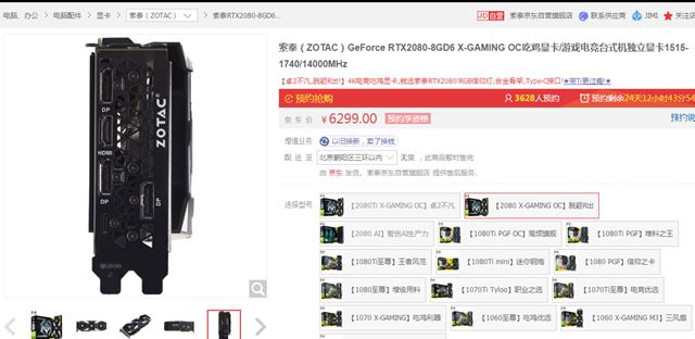 价格最便宜的是6299元,不过很有几款品牌型号均是这个价格,如技嘉 rtx2080 windforce oc、索泰 rtx2080 x-gaming oc、索泰 rtx2080 ai、耕升 rtx2080 炫光 oc,相信这些价格便宜的会更受玩家青睐。