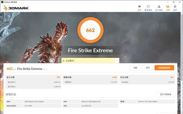 内置的radeon r5核显在3dmark fire strike extreme中的图形分数为706,这分数与a8-7680核显相当。