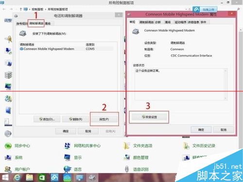 3、选择电话和调制解调器首次启动可能会需要填写区号,比如青岛是0532,北京是010,填一下点击确定即可切到“调制解调器”选项卡点击“属性,点击“改变设置