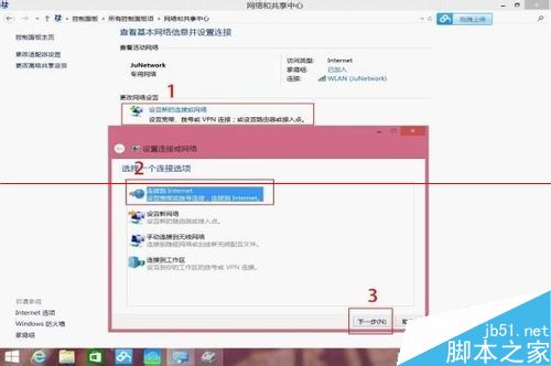 4、设置新的连接或网络连接到internet => 下一步