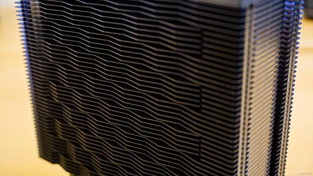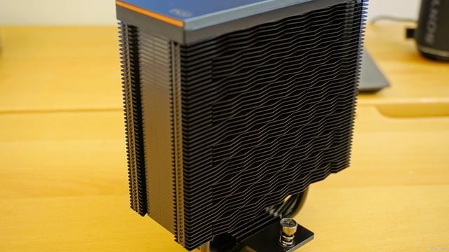 单塔设计散热的塔体使用了50层的散热鳍片,通过扣fin+折fin工艺让结构更稳固,在鳍片一侧还做了波浪形设计,用以提升散热能力,依托气动声学原理设计,有效减小气流阻力,降低风噪杂音,使运行更安静。