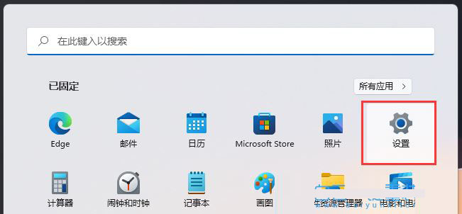 2、打开的开始菜单项中,找到并点击所有应用下的设置;