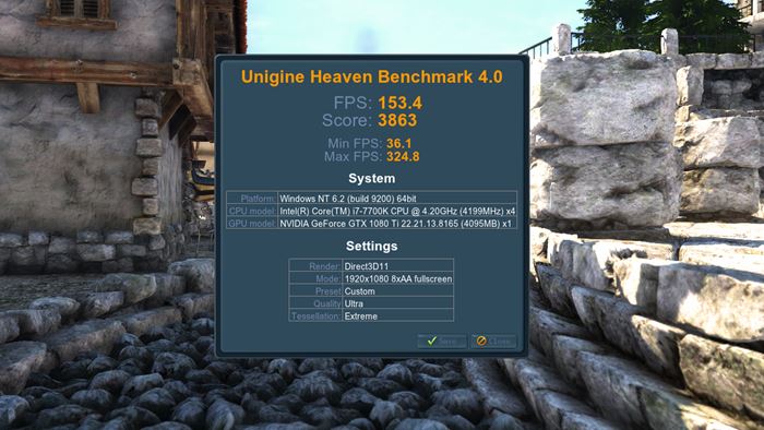unigine heaven benchmark 1080p ultra exreme 3863分,平均153.4帧