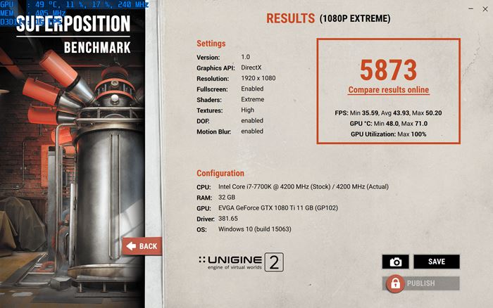 unigine superposition benchmark 1080p extreme 5873分,平均43.93帧