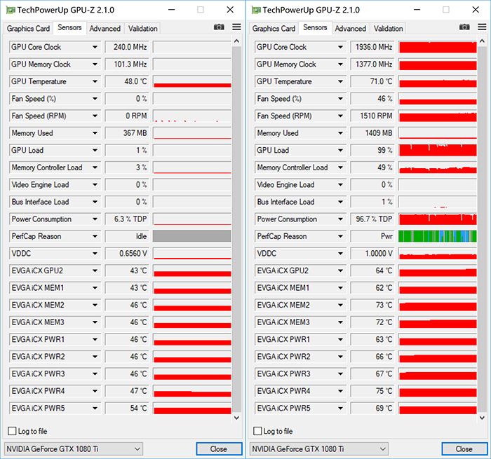 得益于evga增添了9个温度传感器以及控制的mcu处理器,我们可以更加深入地研究显卡的各部分温度。我们可以看到。而gpu-z软件读取的是显卡上gpu核心温度。