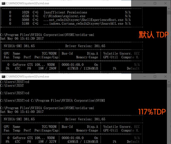 首先我们通过nvidia驱动中附带的smi工具查看显卡默认功耗evga gtx 1080 ti ftw3 gaming默认tdp控制在280w,可以上浮至117%到327w。