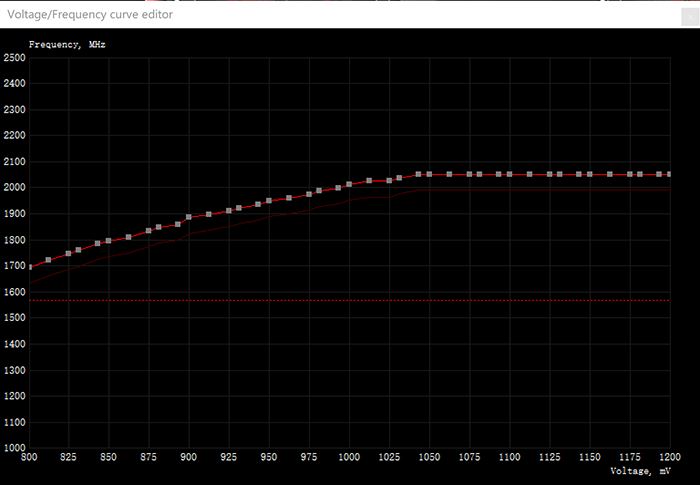 v-f曲线,浅红色为默认设计,深红色为超频后电压与频率对应关系。