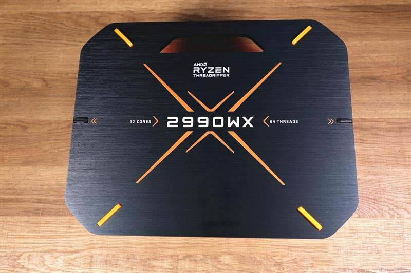 采用铝合金板作为包装盒的底板,中间标注了处理器型号2990wx。