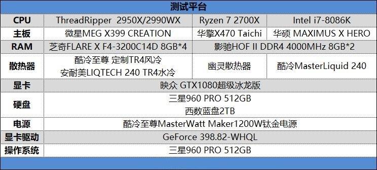 2990wx、2950x官方设定的对手分别是i9-7980xe、i9-7900x,不过很不巧,手头暂时没有这两款处理器,所以本次评测借用了二者之前的一些测试数据。