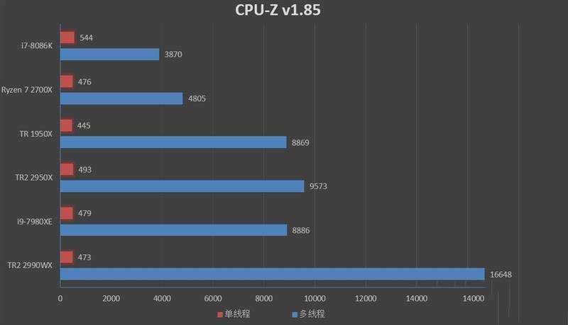 在cpu-z测试中,2950x多线程分数为9573,领先i9-7980xe 11%,32线程反杀36线程;2990wx更是能够领先后者87%。