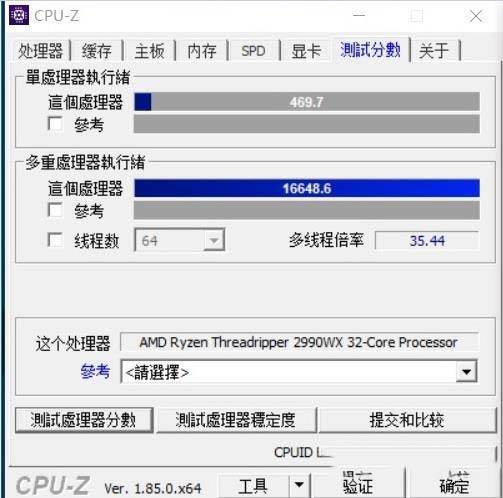 cpu-z除了能查看处理器各种信息之外,在测试分数界面还提供了cpu性能测试功能。测试分为两种模式:单线程/多线程,两种模式分别对cpu的单线程和多线程进行测试,然后给出相对应的分数作为参考。