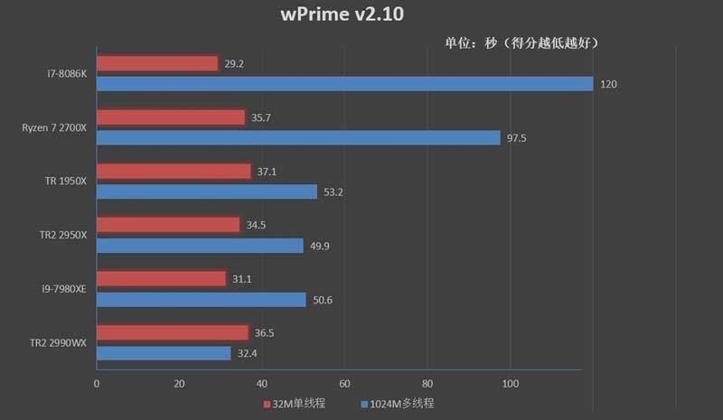 在wprime 32m单线程性能测试中,2990wx耗时36.5秒,比7980xe慢了5.4秒。