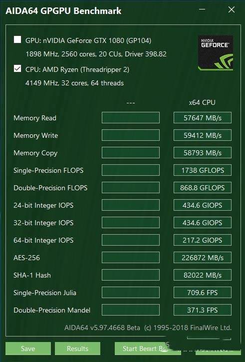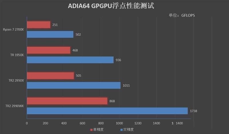 aida64 gpgpu测试可以较为准确的反应cpu的单精度、双精度浮点运算能力。7980xe支持的avx512指令集可以大幅度提高测试时的浮点成绩,但目前还没有哪一款软件能够支持avx512指令集,因此intel的cpu不参与此项对比。