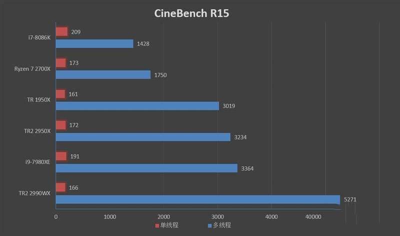 在cinebench r15测试中,2990wx领先7980x接近2000cb,领先幅度57%。2950x相比7980xe则落后了130分,但是比上代1950x高了200cb。