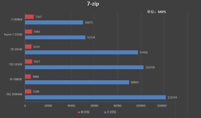 在7-zip测试中。2990wx以121534mips的成绩领先7980xe 35%,2950x同样也比7980xe要强12%。