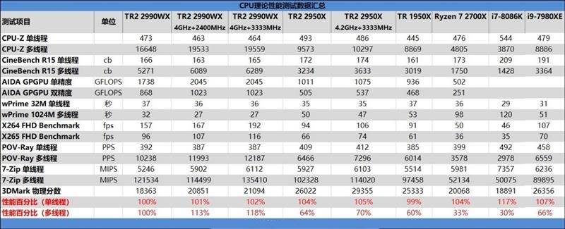 在cpu理论性能方面,默频状态下的16核的2950x就已经和intel顶级的18核7980xe相差无几,超频后反超了后者,领先幅度为6%。