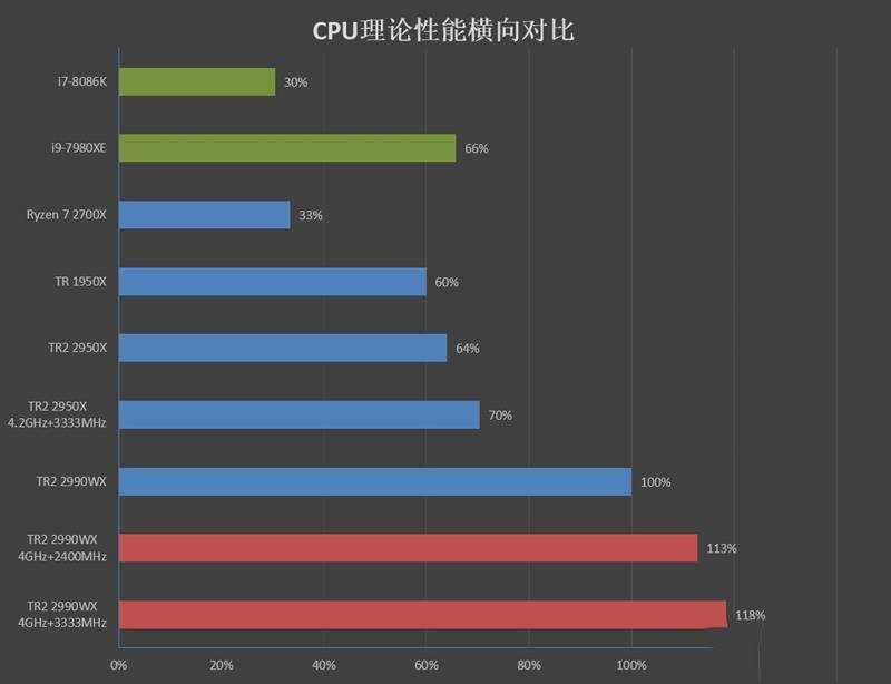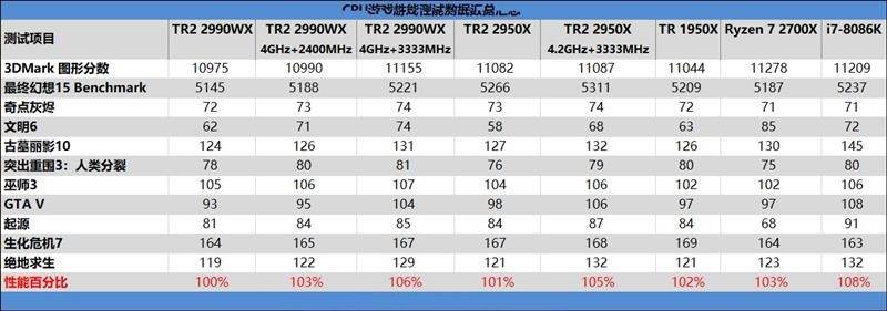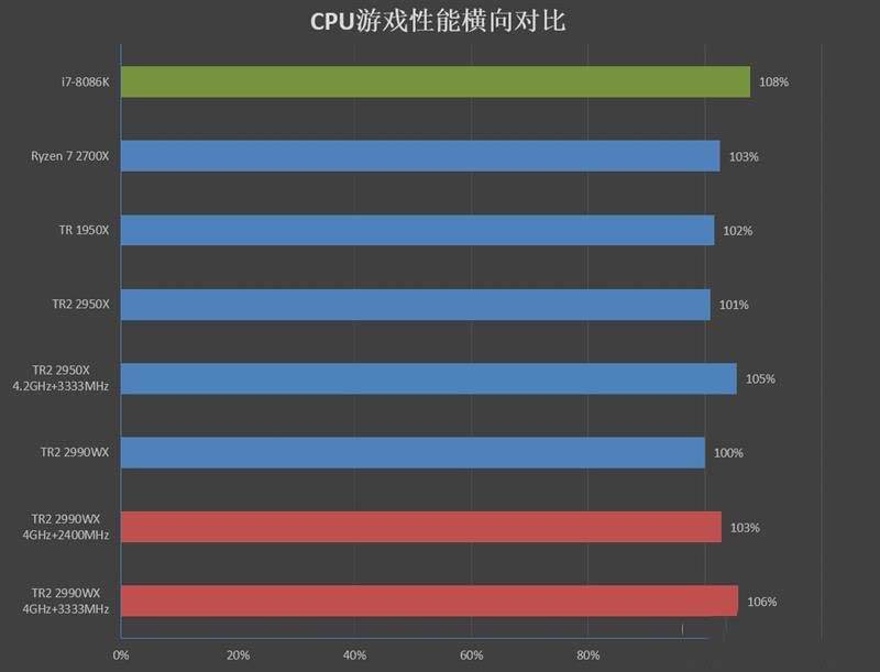 由于默认全核频率较低的原因,2990wx与8086k这种游戏cpu之间有8%的差距,将cpu内存超频到4.0ghz、3333mhz时,2990wx的游戏性能已经非常接近8086k,双方仅有2%的差距。