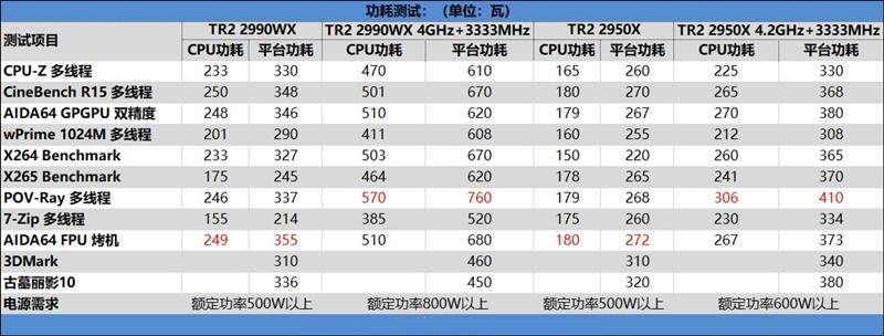 第二代amd锐龙threadripper处理器更多时候是面对专业领域,我们记录了2款cpu在运行各种软件的最高功耗,将数据汇总如下: