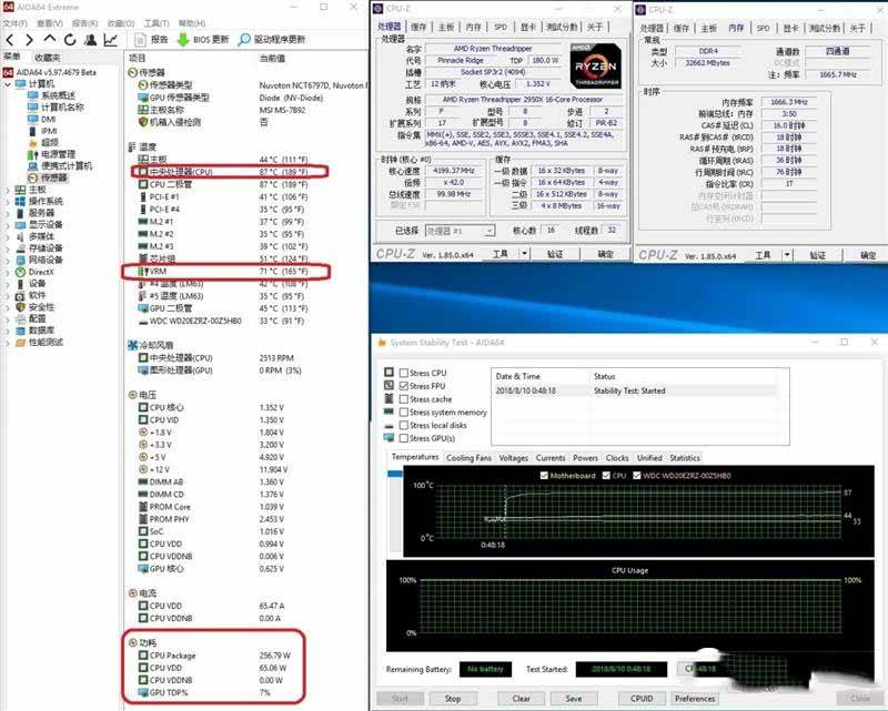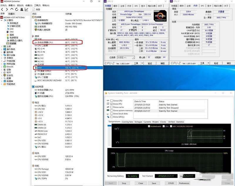 将2990wx超频到1.41v 4.2ghz时候,使用水冷散热。运行aida64 fpu 10分钟后,cpu及主板各项温度值趋于稳定。此时cpu核心功耗达到了的480w,cpu温度为88度,主板供电mosfet温度为105度。